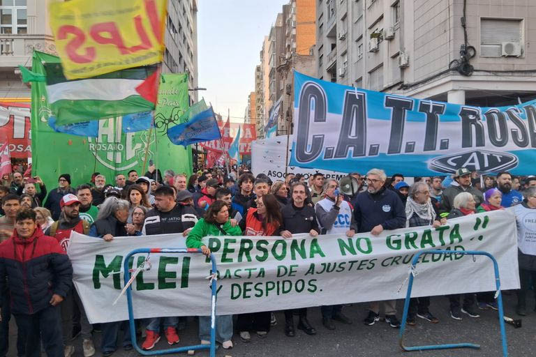 El contexto fuera de la Bolsa mostró otra postal. A diferencia de la ovación que había recibido en 2024, esta vez lo aguardó una movilización gremial en repudio a su visita. El centro rosarino estuvo vallado y bajo un fuerte operativo de seguridad, que incluyó cortes de calles y controles estrictos.
