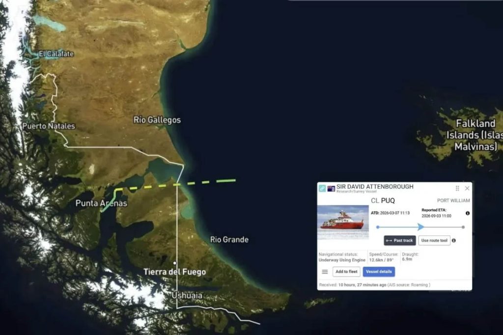 El rompehielos británico RRS Sir David Attenborough volvió a cruzar aguas argentinas tras su paso por Punta Arenas, en Chile, en una derrota con destino a las Islas Malvinas, según reporta el periodista Alejo Sánchez Piccat en el sitio web Escenario Mundial. El movimiento fue reflejado por plataformas de seguimiento marítimo, que ubicaron al buque navegando en el extremo sur del continente luego de zarpar desde el puerto chileno. Pero el dato más sensible no es solo el trayecto: el buque volvió a hacerlo identificado con bandera del gobierno ilegal de las Islas Malvinas, una situación que reactualiza un debate ya abierto sobre soberanía, navegación y respuesta oficial argentina.