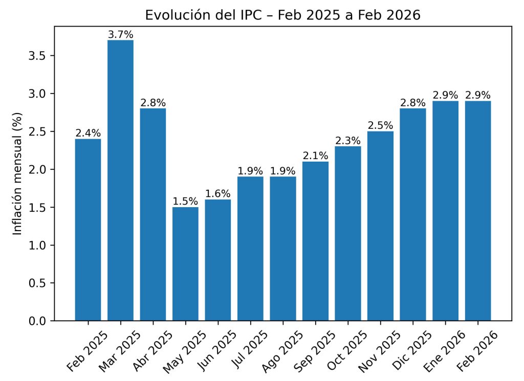 Con el dato de febrero, el IPC mantiene una tendencia de subas moderadas pero persistentes, con variaciones mensuales cercanas al 3% desde mediados del año pasado.