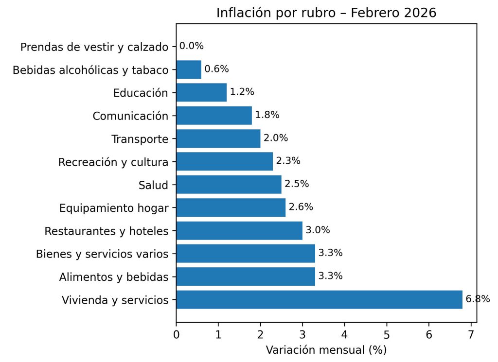 Entre los rubros que más aumentaron en febrero se destacó Vivienda, agua, electricidad, gas y otros combustibles, con una suba de 6,8%, impulsada principalmente por ajustes en tarifas y cambios en el esquema de subsidios.